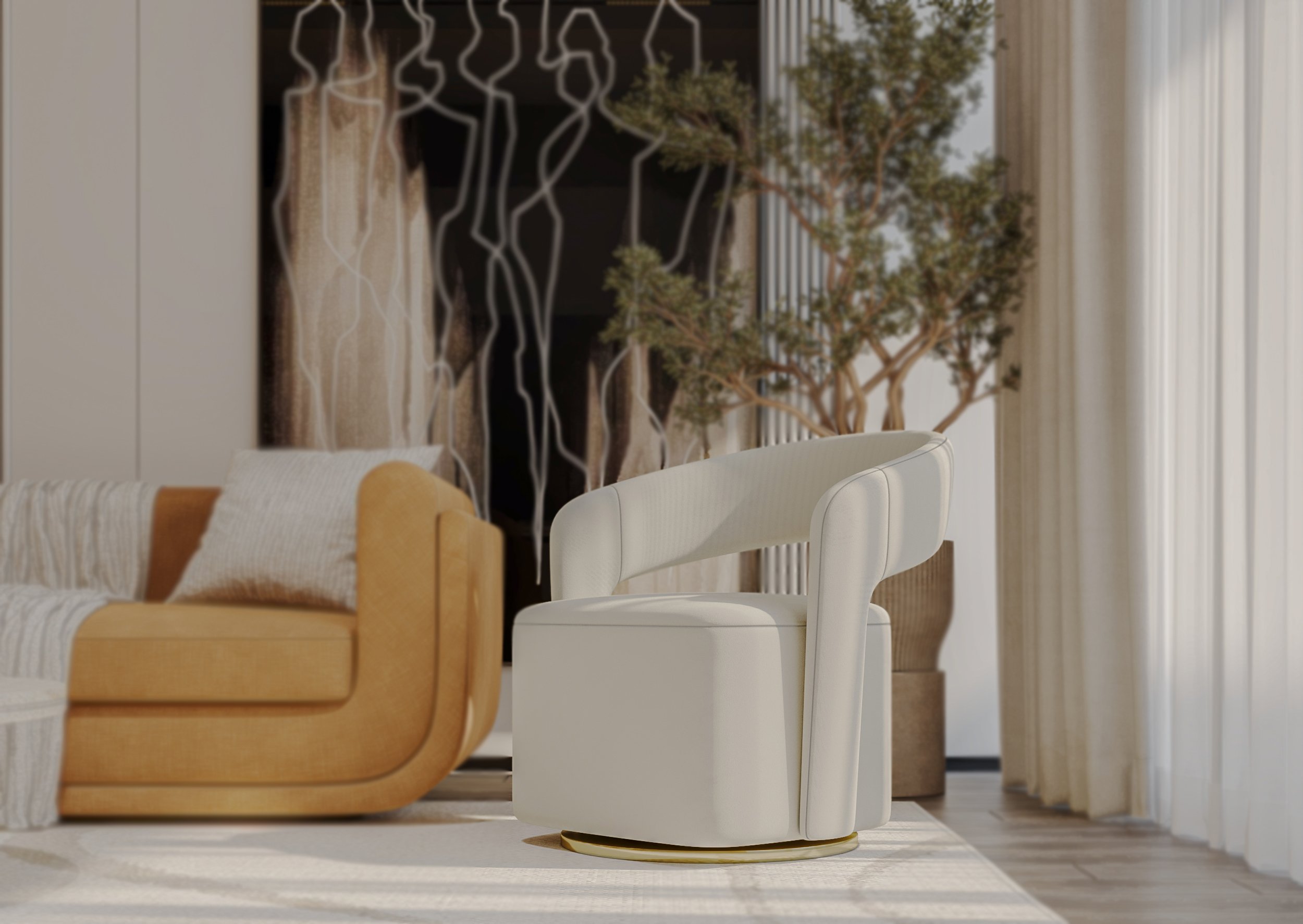 The Valencia living room unfolds in warm tones and sculptural forms, where every element holds its place. The armchair, wrapped in leather and textured fabric, quietly punctuates the space—an accent that balances comfort and design.